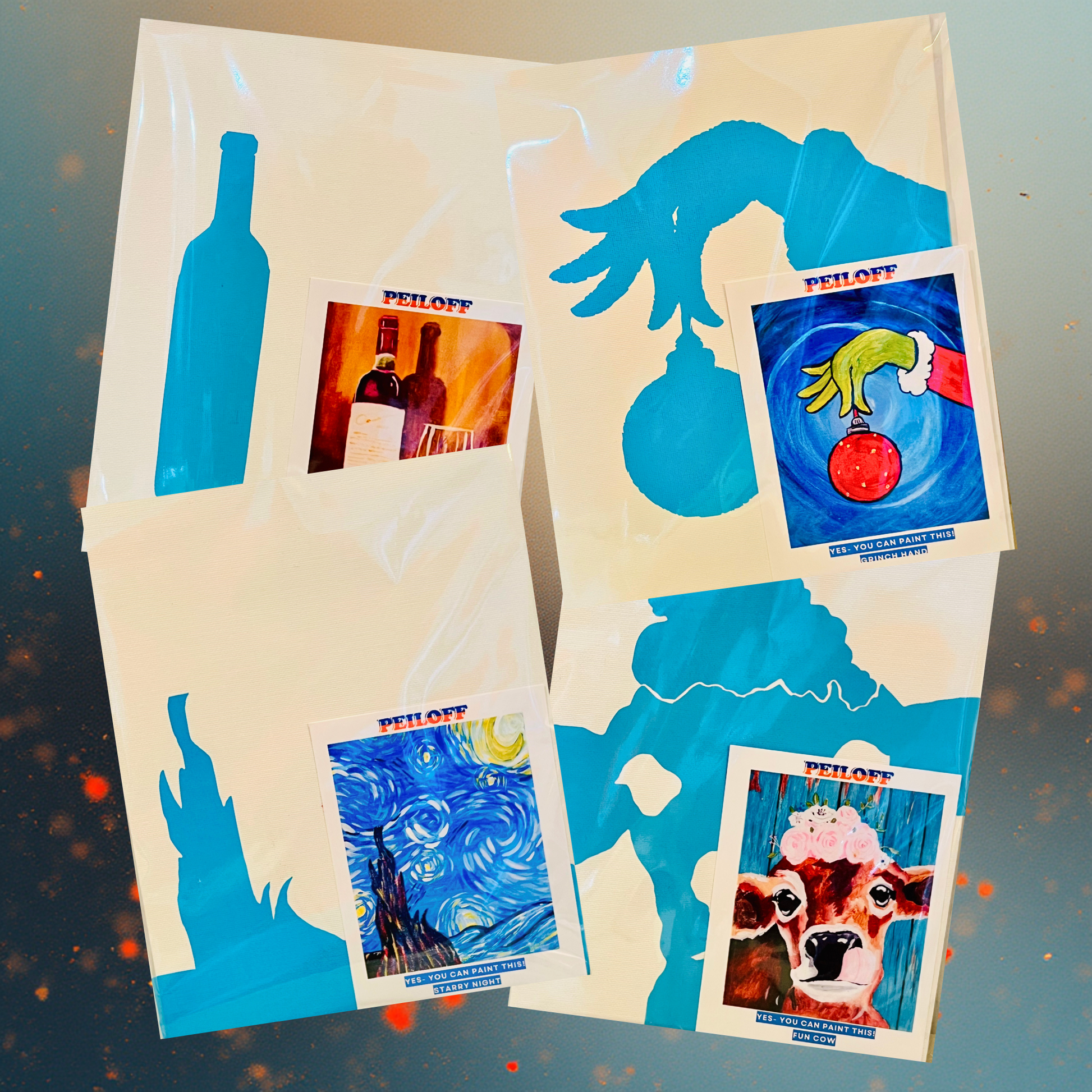 Unleash your creativity with ease this holiday season! The Peiloff 8x10 Canvas Pack comes with 3 or 6 pre-stenciled 8x10" canvas panels—perfect for cozy nights in, gifting, or hosting your own mini paint party.